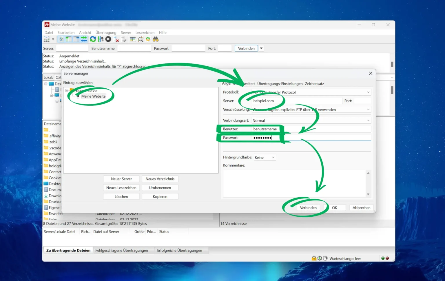 Verbinden Sie sich mit Ihrem Webserver. Nutzen Sie dazu ein FTP-Programm (FileZilla ist ein beliebter Kandidat und kostenlos). Öffnen Sie den Servermanager (Datei ➞ Servermanager), klicken Sie auf den Button "Neuer Server", benennen Sie den Server und geben Sie die FTP-Zugangsdaten ein. Nun klicken Sie auf "Verbinden".