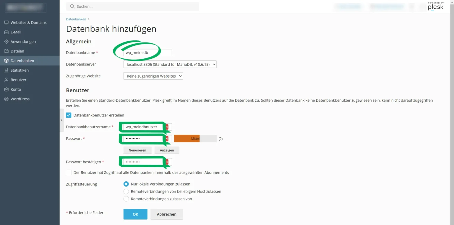 Erstellen Sie eine neue Datenbank. Ein paar Klicks, ein paar Eingaben (Datenbankname, Datenbankbenutzername, Passwort) - und schon ist Ihre neue Datenbank bereit. Notieren Sie sich den Namen der Datenbank, den Benutzernamen und das Passwort. Das brauchen wir gleich noch!