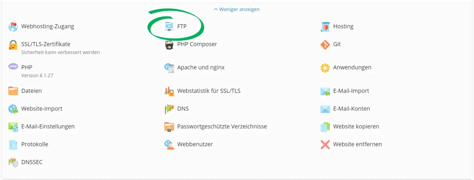 Ermitteln Sie die FTP-Zugangsdaten (Benutzername, Passwort), die Sie von Ihrem Hosting-Anbieter bekommen haben. Sie finden die Informationen zu Ihren FTP-Konten auch im cPanel, Plesk, oder im Site Tools Dashboard Ihres Hosting-Kontos. Für diese Anleitung zeige ich Ihnen die weitere Vorgehensweise anhand des Beispiels von Plesk.