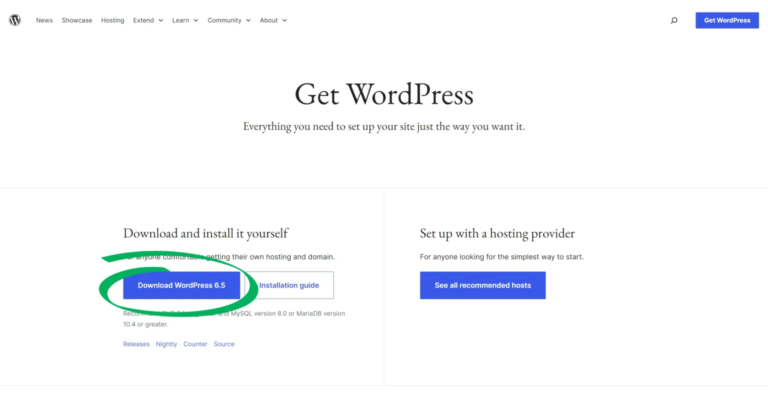 - Schnappen Sie sich WordPress mit dem direkten Download-Link ↗ und folgen Sie dieser Anleitung, um Ihre Website zu starten.