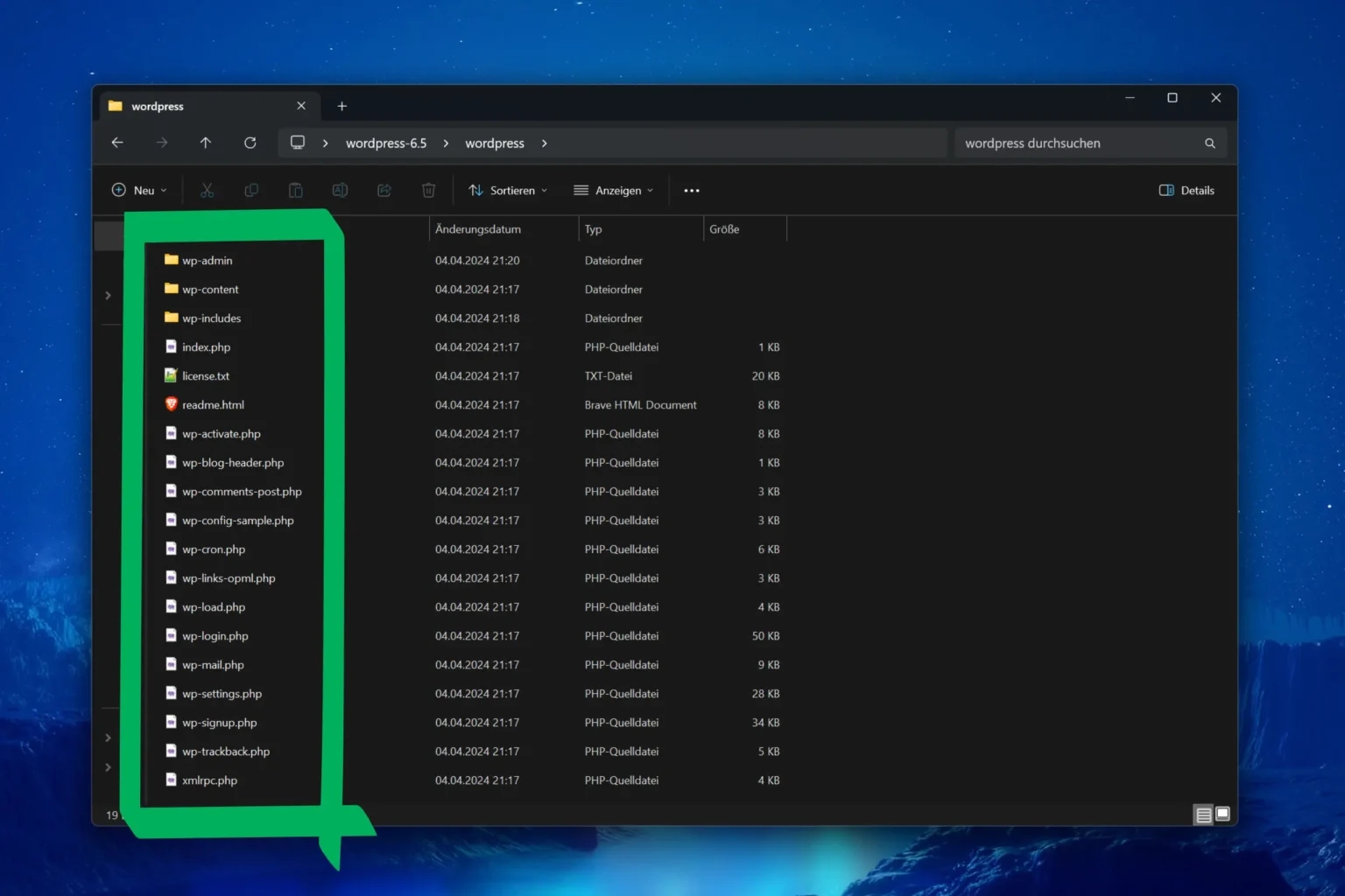 Packen Sie die heruntergeladene ZIP-Datei aus. Im Inneren finden Sie einen Ordner namens "wordpress" mit allem Drum und Dran.