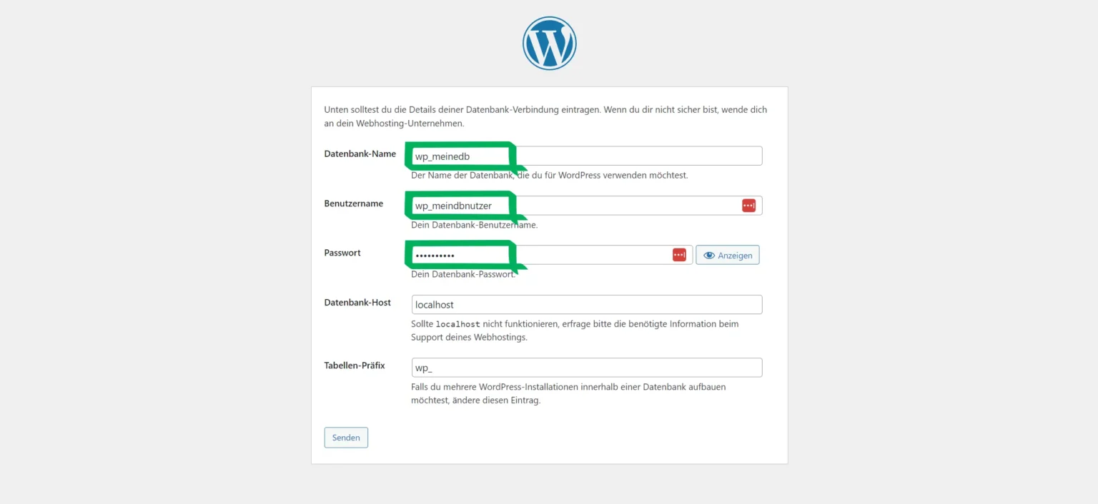 Hier werden die Datenbankinformationen abgefragt, die Sie gerade erstellt haben. Ausfüllen und mit "Senden" abschicken. Danach auf "Installation durchführen" klicken.