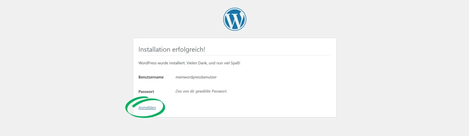 Erfolg und fertig! Sobald Sie alle Schritte durchlaufen haben, ist WordPress installiert und einsatzbereit. Jetzt können Sie sich im Backend einloggen und mit dem Aufbau Ihrer Website beginnen.