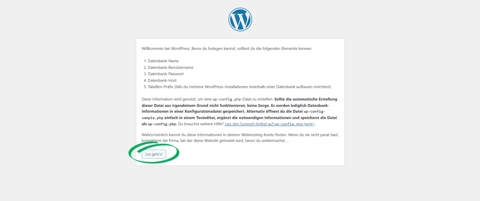 Willkommen bei WordPress! Der Assistent ist super freundlich und führt Sie durch die nötigen Schritte. Klicken Sie auf "Los geht's!".