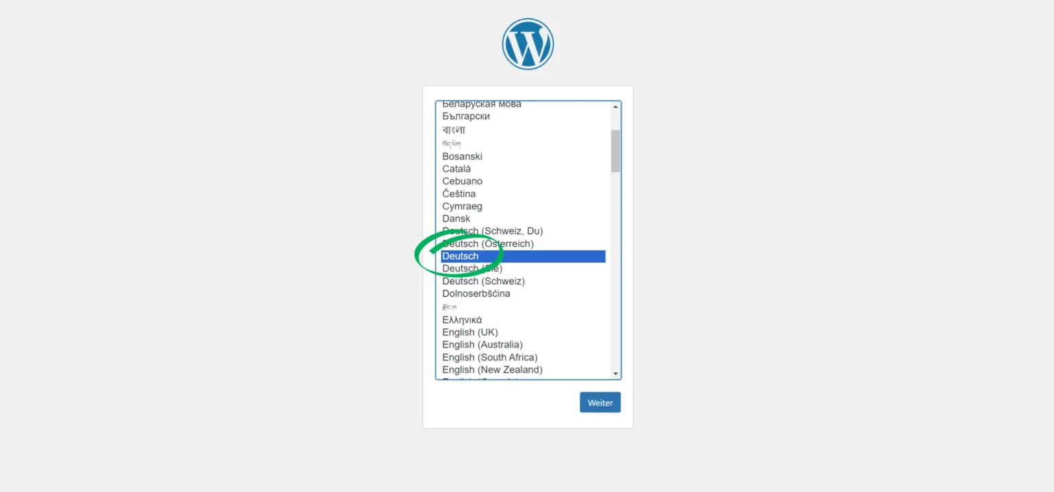 Sprachauswahl. Gleich zu Beginn werden Sie gebeten, die Sprache für Ihre WordPress-Installation auszuwählen. Tipp: falls Sie unsicher sind, welche Deutsche Sprache Sie wählen sollen, empfehle ich die Auswahl "Deutsch". Warum? Weil diese Auswahl bei vielen der meistgenutzten Plugins und Themes über den bestmöglichen Übersetzungsgrad verfügen. Treffen Sie Ihre Wahl und fahren Sie fort.