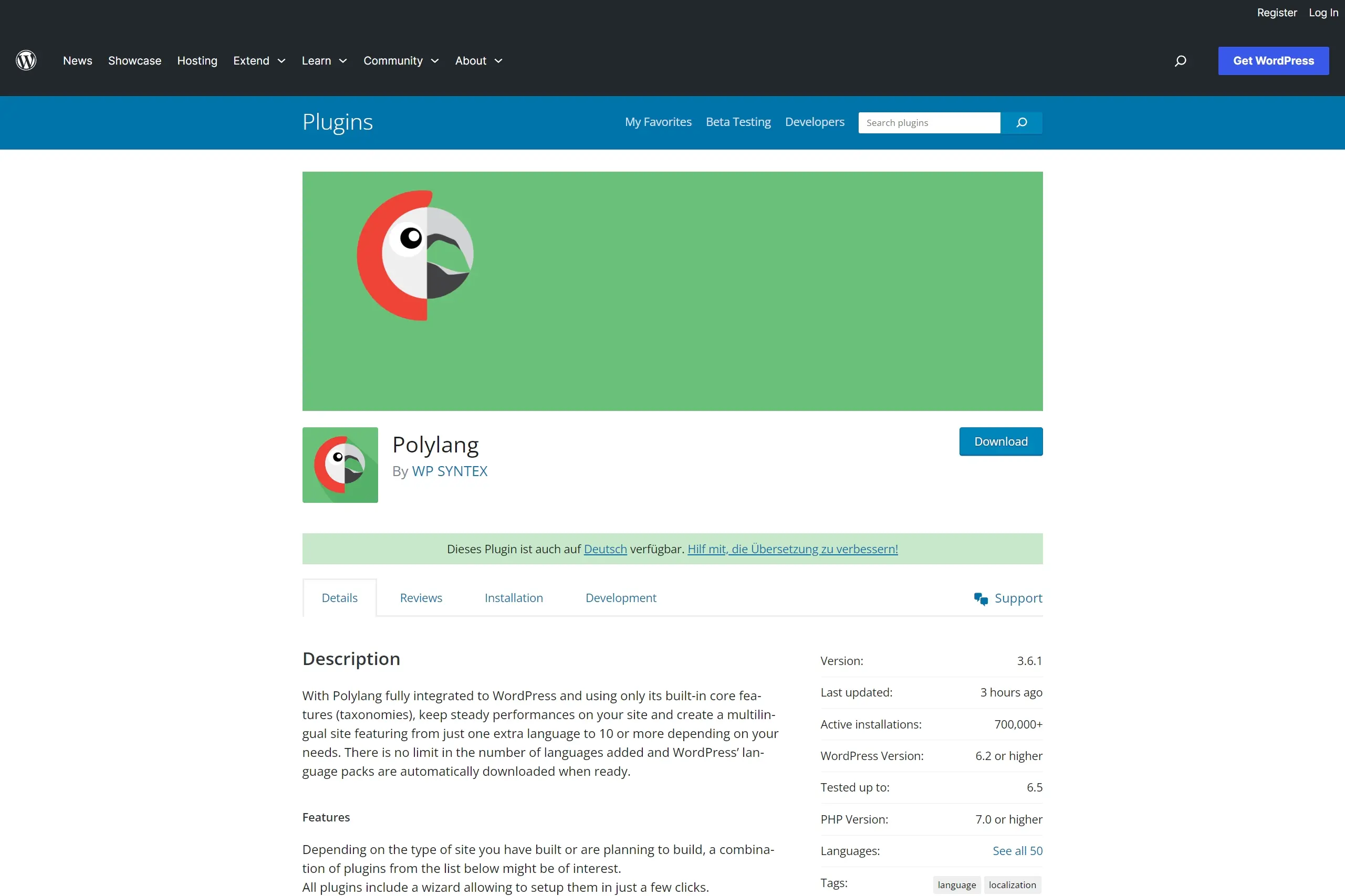 Polylang ↗ ermöglicht das Erstellen mehrsprachiger WordPress-Sites durch Übersetzung von Beiträgen, Seiten, Medien und Kategorien. Die Sprachwahl kann über die URL, Subdomains oder verschiedene Domains pro Sprache erfolgen.