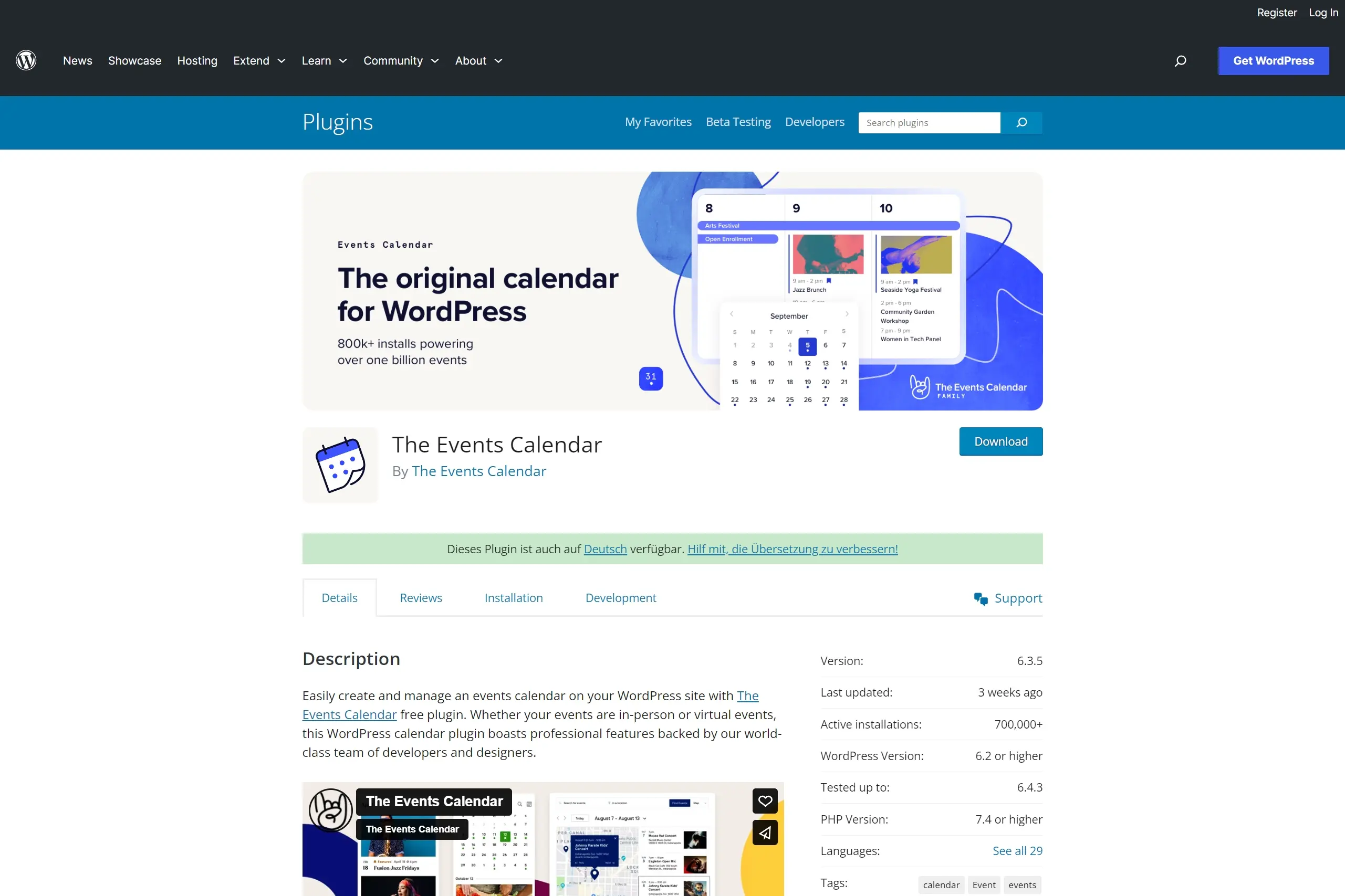 | Events | The Events Calendar | 4.5/5 | 700'000+ | Ja | Freemium |