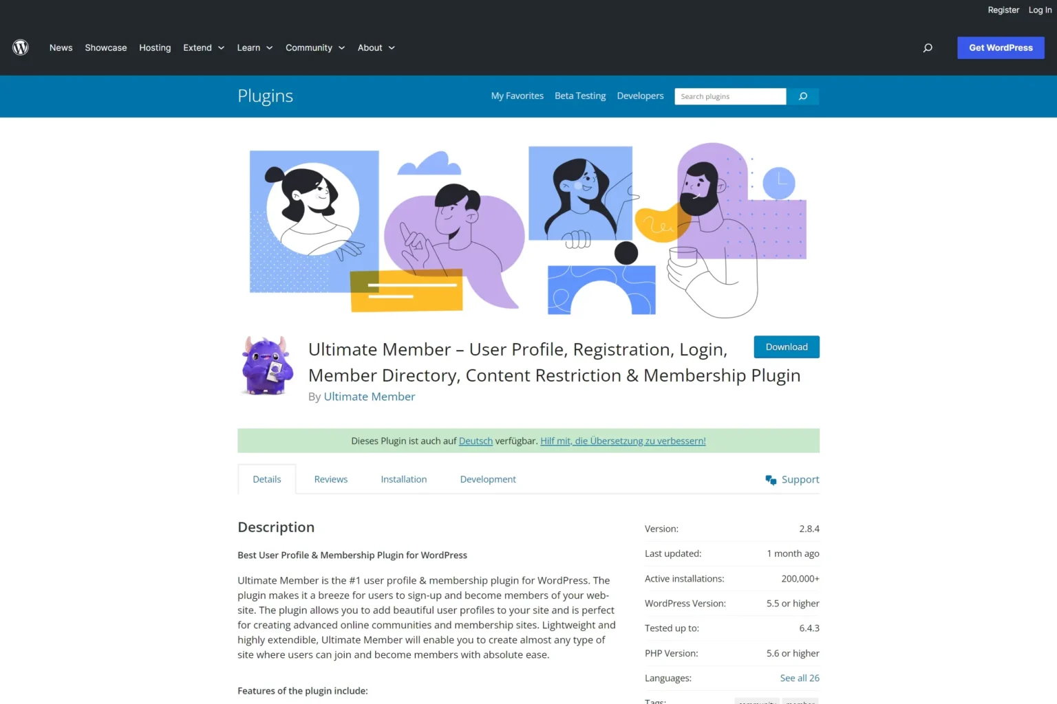 Ultimate Member ↗ bietet Funktionen wie Frontend-Profile, Registrierung und Login, Formularfelder nach Bedingung, ein Drag-and-Drop-Formular-Builder und Inhaltsbeschränkungen. Es ist ideal für Online-Communitys und Mitgliederseiten, da es leicht erweiterbar ist und fast jeden Website-Typ ermöglicht, wo Benutzer beitreten können.