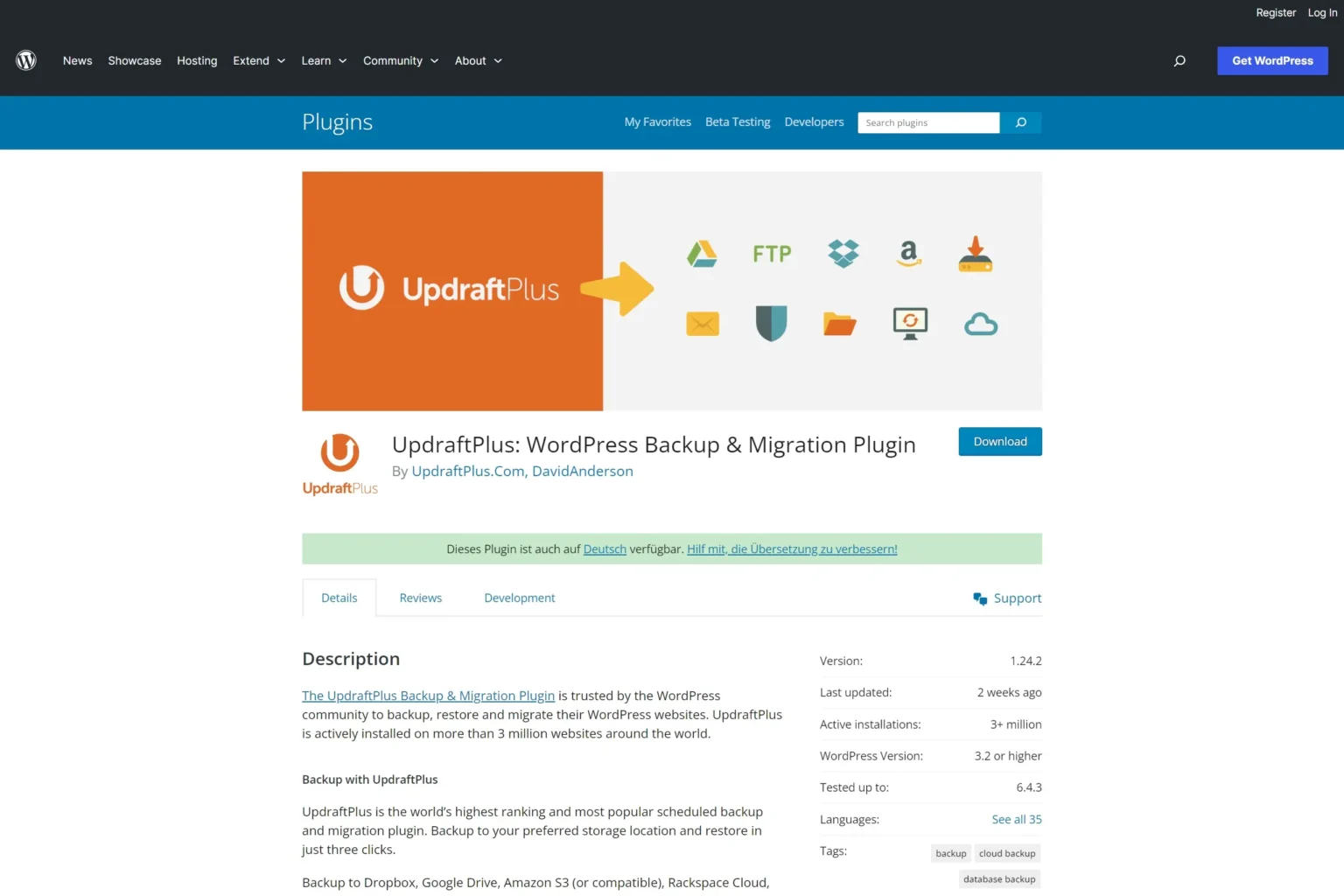 UpdraftPlus ↗ ist ein Plugin für WordPress-Backups und Migrationen, das es ermöglicht, Ihre Website einfach zu sichern, wiederherzustellen und zu migrieren.