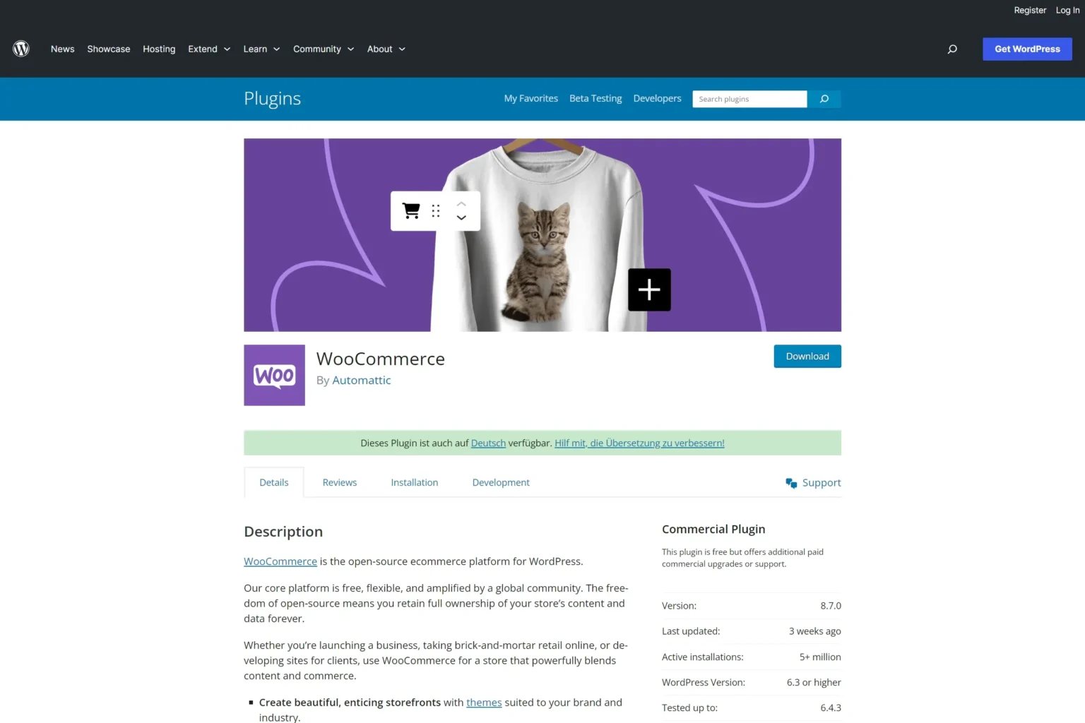 WooCommerce ↗ ist ein flexibles E-Commerce-Plugin für WordPress, das es Ihnen ermöglicht, physische und digitale Produkte zu verkaufen.